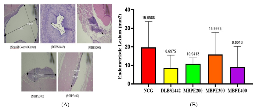 The measurement of the endometriosis lesion area in this study was conducted using the Hematoxylin-Eosin (HE) staining method, which enables accurate histological identification of tissue morphology. The visual analysis results presented in Figure 6(A) demonstrate striking differences in lesion area between the negative control group (NCG) compared to the intervention groups, namely the DLBS1442 group and all MBPE groups (200, 300, 400). This visual comparison illustrates that both MBPE administration and standard DLBS1442 therapy provided substantial impact in reducing endometriosis lesion size relative to the negative control group. These visual findings were confirmed through Kruskal-Wallis statistical analysis, the results of which are presented in Figure 6(B). The statistical test results showed that all treatment groups, both MBPE and standard DLBS1442 therapy, experienced a significant reduction in lesion area compared to the negative control group (NCG). Specifically, the most significant lesion area reduction occurred in the standard DLBS1442 therapy group, followed by the MBPE400 group as the dose demonstrating the highest effectiveness among the extract groups.