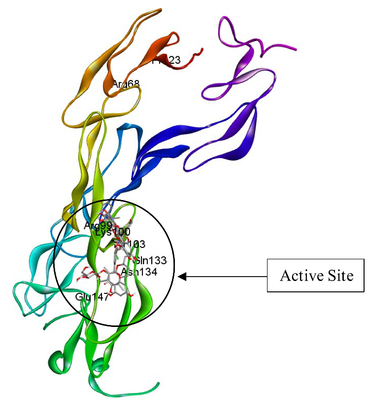 For method validation, the native ligand was redocked into the active site of the target protein, and the RMSD was calculated (with a cut-off of <2.0 Å). Molecular docking simulations were carried out using AutoDock version 4.2.3, with parameters such as 100 LGA runs, 150 population size, and 25,000,000 evaluations. The grid box configuration was adjusted to cover the protein’s binding site with dimensions of 40×40×40 Å3 and grid spacing of 0.375 Å.