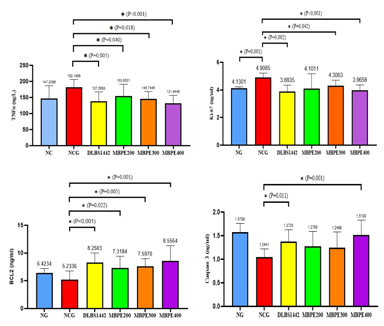 Ki-67 was analyzed using one-way ANOVA after confirming normal distribution across all groups, although Levene’s test indicated non-homogeneous variances (p = 0.001). Results showed significant differences among groups (p = 0.003). The NGC group demonstrated the highest Ki-67 expression (4.909 ± 0.308), while MBPE400 (3.841 ± 0.286) and DLBS1442 (3.884 ± 0.458) showed the lowest levels, even below the normal control NC (4.130 ± 0.099).