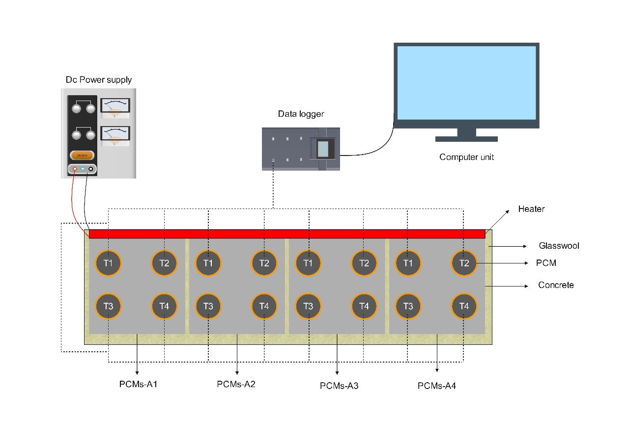 In this study, concrete was installed with 4 copper tubes as PCM encapsulation media. Several thermocouples connected to a data logger were installed in the PCM encapsulated concrete to monitor temperature distribution. A heater at a constant temperature of 80 °C was applied to the PCM encapsulated concrete as the heat source. Rock wool was utilized as an insulation material to minimize heat loss. The experimental setup is illustrated in Figure 2. All prepared PCM specimens were poured into a copper tube inside the concrete (5×5×5 cm3). The samples consisted of 4 PCM specimens and were provided with an accurate calibrated measuring device to evaluate and compare their thermal performance. These devices use K-type thermocouples connected to an Arduino-based digital readout monitor. Temperature distribution measurements were conducted for 24 h per day. The temperature distribution experiment was conducted to test the thermal performance of PCM encapsulated in a concrete. The samples consisted of all PCM encapsulated concrete samples with different magnetite compositions.