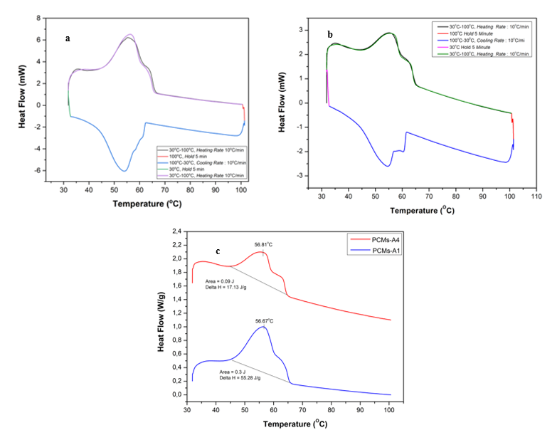 Figures 7(a) - 7(b) are the results of DSC characterization comparison between PCM-A1 and PCM-A2 samples at 1.5 cycles with an initial temperature of 30 °C and then heated to 100 °C with a temperature increase of 10 °C/min. In the first and fifth steps, PCM melting occurs, whereas in the third step, PCM solidification occurs. The coverage of the heat flow during the heat absorption and heat release process in the PCM-A1 sample, which contained 20 vol% Fe3O4 suggested a wider coverage than the PCM-A4 sample with the addition of 50 vol% Fe3O4. Figures 7(a) - 7(b) confirm that the PCM cycles can be repeated and do not exhibit a shift in the heat flow and thus remain stable [42]. The PCM melting process was found to be endothermic, as illustrated in Figure 7(c). Results indicate that the enthalpy values for the PCM-A4 and PCM-A1 samples were 17.13 and 55.28 J/g, respectively. The addition of Fe3O4 led to a decrease in the enthalpy and heat storage capacity of the PCM. However, this resulted in a significant increase in the thermal absorption region. The endothermic peak in the graph corresponds to the melting point of the PCM. In this study, the melting points for the PCM-A1 and PCM-A4 samples were found to be 56.67 and 56.81 ℃, respectively.