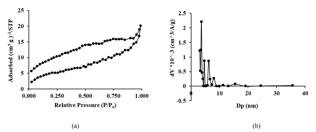 The N2 adsorption-desorption isotherm of AC-CR, seen in Figure 2, exhibits a type IV isotherm with an H4 hysteresis loop. Figure 2(a) illustrates that the hysteresis loop features a desorption line plateau between 0.75 to 0.92 P/P0. This resembles the hysteresis loop observed in activated carbon derived from durian shell waste [23]. Porous adsorbents often display a type IV isotherm during capillary condensation. Consequently, AC-CR ought to serve as the mesoporous adsorbent [24]. The adsorbent exhibiting a type IV isotherm and an H4 loop comprises micropores and mesopores [25,26].