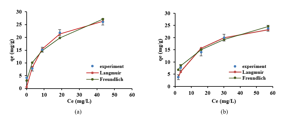 The adsorption isotherm clarifies the distribution of molecules between the liquid and solid phases at equilibrium during the adsorption process. This study analyzed the adsorption data using the Langmuir and the Freundlich isotherms.