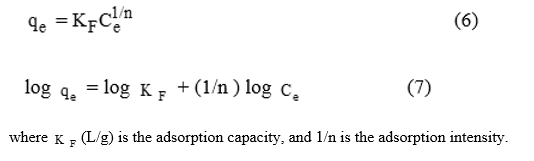 The Freundlich isotherm is expressed in nonlinear and linear forms in Eqs. (6) - (7), respectively.