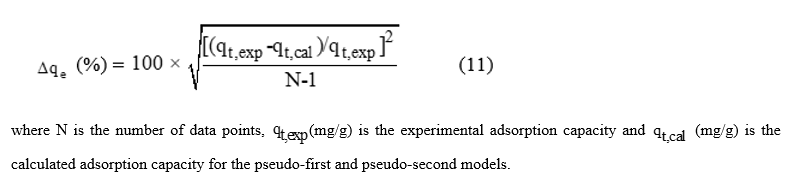 To determine which model best describes the adsorption process, one uses Eq. (11) to calculate the normalized standard deviation, or ∆qe (%) [21].