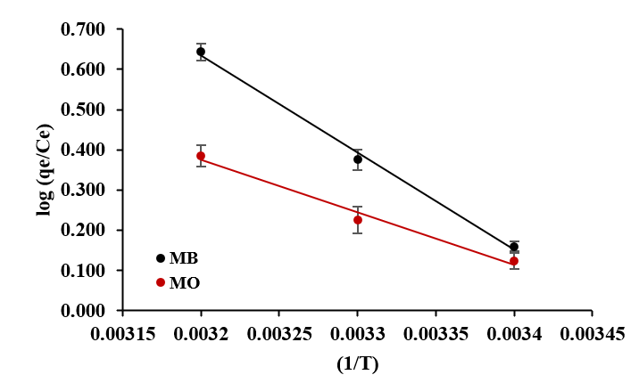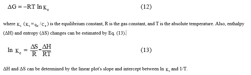 The thermodynamic behavior is analyzed to comprehend the variations in Gibbs energy (ΔG), enthalpy (ΔH) and entropy (ΔS) by examining the adsorption of the adsorbate onto the adsorbent’s surface. The Gibbs free energy change ( G) in the adsorption process can be expressed by Eq. (12).