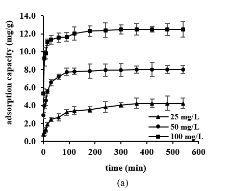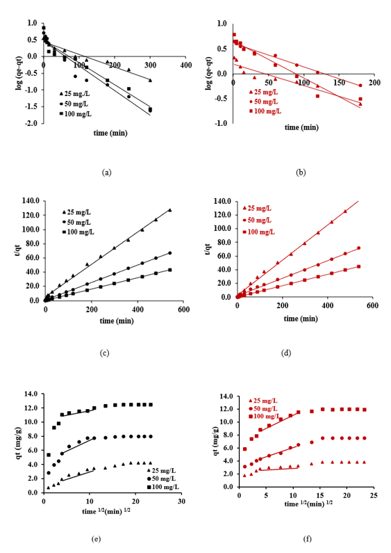 The study of adsorption kinetics can yield significant insights into the adsorption mechanism. The experiment investigates the adsorption capacity of an adsorbate onto an adsorbent across various time intervals. This study employs the pseudo-first-order, pseudo-second-order and intraparticle diffusion models to analyze the adsorption data. Eqs. (8) - (10) describe the linear representations of the pseudo-first-order, pseudo-second-order and intraparticle diffusion models, respectively.