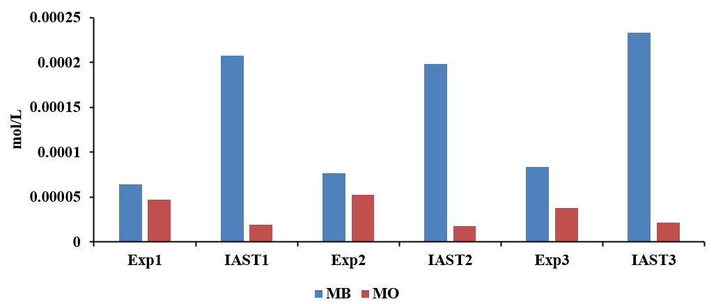 The residual concentrations of MB and MO in the binary system were quantified using Eqs. (14) - (15). These values were subsequently analyzed using the Ideal Adsorbed Solution Theory (IAST), which assumes that all mixture components behave as ideal adsorbed solutes, implying no interactions between the adsorbates and the adsorbent [60]. Binary adsorption tests were conducted using three sets of MB and MO solution mixtures at concentration ratios of 1:1, 1.5:1 and 1:1.5. The combined equilibrium concentrations from each set were applied in the IAST model. Figure 14 presents the adsorption concentrations (mol/L) of each component (MB and MO) in the respective experiments (Exp1, Exp2 and Exp3), alongside the corresponding IAST predictions (IAST1, IAST2 and IAST3). The IAST calculations were carried out using Excel Solver.