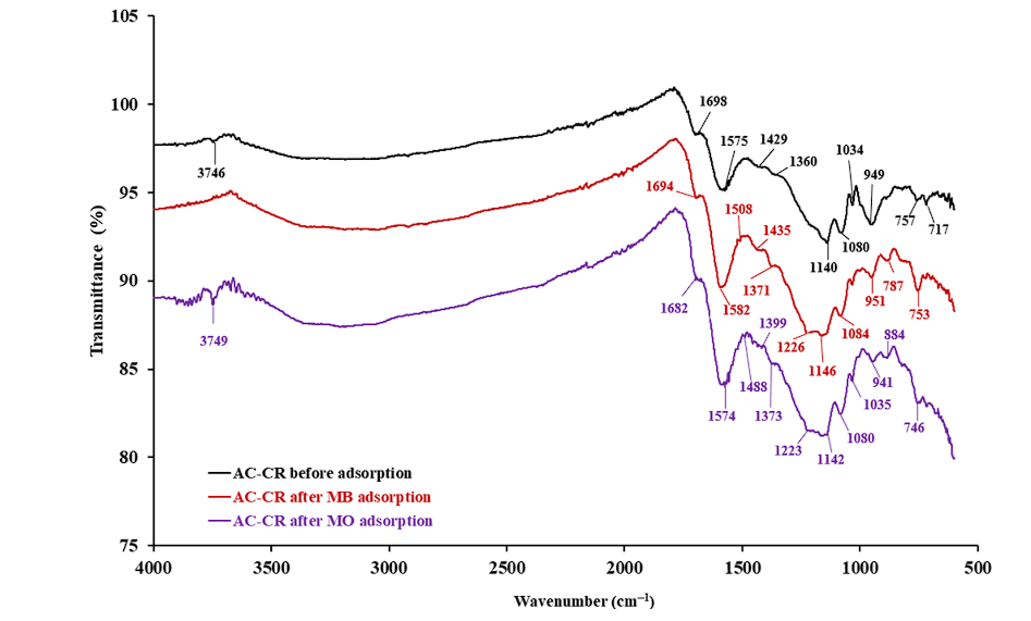 Surface oxides in AC-CR can be characterized by Boehm titration. The surface comprises acidic groups (0.83 meq/g)—carboxylic (0.47 meq/g), phenolic (0.32 meq/g) and lactonic (0.06 meq/g)—as well as a negligible amount of basic groups (0.12 meq/g). Acidic groups, including carboxylic, phenolic and lactonic, enhance surface polarity, hence facilitating stronger electrostatic interactions and hydrogen bonding with polar adsorbates such as methylene blue (MB) and methyl orange (MO).