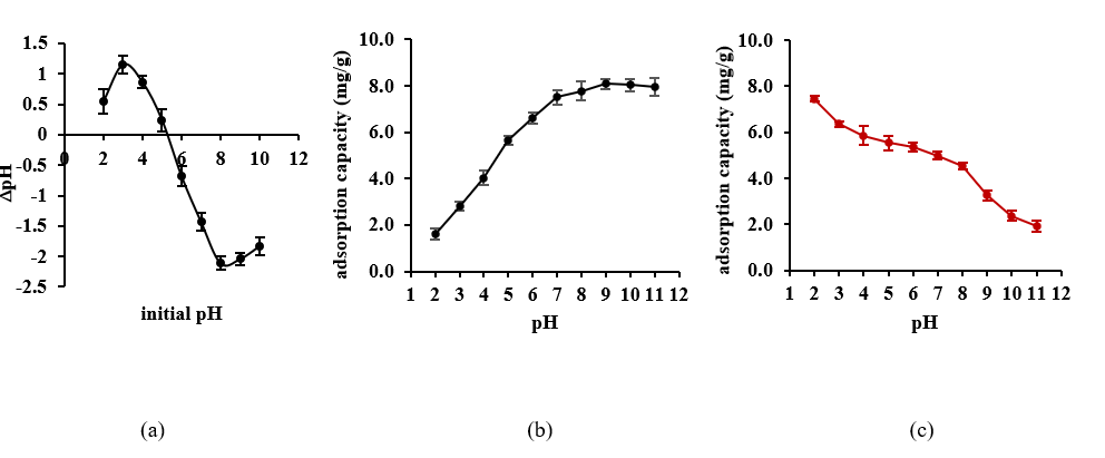 The pH drift method was employed to determine the pH at the point of zero charge (pHpzc). A series of 0.1 M KNO3 solutions with pH values ranging from 2 to 11 was prepared. The pH (pHinitial) of each KNO3 solution was measured using a pH meter (Ohaus, USA) after adding 0.1 M HCl and 0.1 M NaOH. Subsequently, 0.1 g of adsorbent was added to each 100 mL of 0.1 M KNO3 solution and the mixtures were agitated at 150 rpm for 48 h. After filtering the mixtures, the pH (pHfinal) of the solution was measured. The pHpzc was determined by plotting the curve of each ΔpH (pHfinal - pHinitial) against pHinitial. The pHpzc is the point where the curve of pHfinal intersects with the horizontal line that ΔpH = 0.