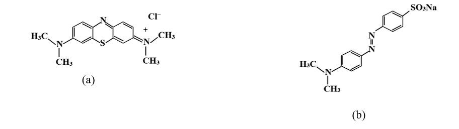 Methylene blue (MB) is a widely used cationic dye employed in chemical indicators, coloring agents, and biological dyes. The concentration of MB in different industrial effluents fluctuates based on the specific processes employed. Wastewater generated from textile dyeing and printing may include substantial concentrations of MB, varying from 10 to 1000 mg/L. Releasing wastewater containing MB into natural water bodies may harm ecosystems and aquatic life. The implications of MB-saturated wastewater on human health are very alarming. It is widely acknowledged that MB is detrimental to aquatic organisms, including fish, algae and invertebrates. [5]. Methyl orange (MO) is a prevalent anionic dye primarily utilized as an indicator in scientific assays and as a coloring agent in the textile industry. Wastewater containing MO is not highly conducive to chemical or biological treatment. MO possesses the potential to be genotoxic and carcinogenic, harming both aquatic organisms and human health [6].