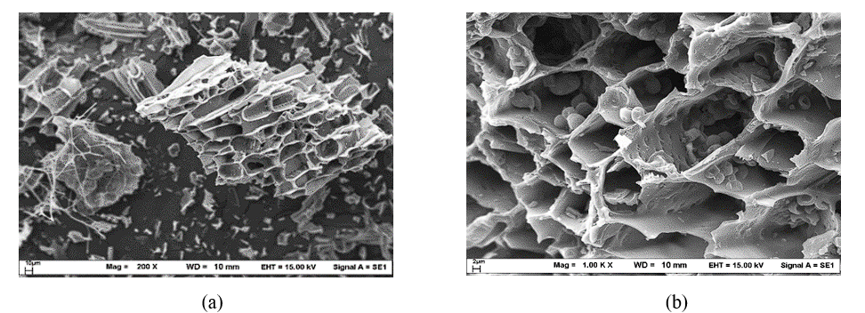 Figure 3 Scanning electron micrograph of AC-CR adsorbent at 200 (a) and 1000 (b) magnification.