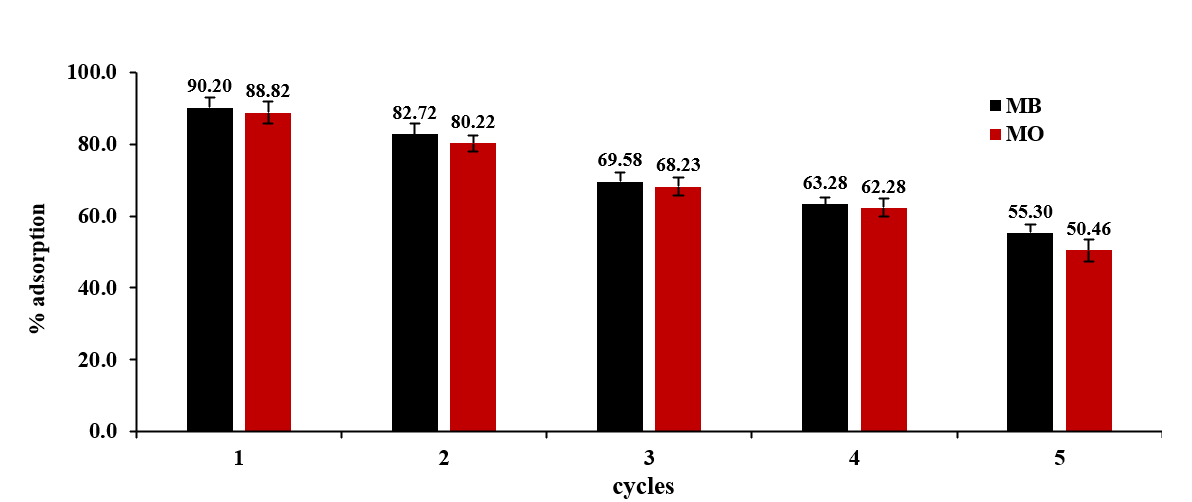 To maximize the efficiency of the prepared activated carbon, it was proposed that the used activated carbon be regenerated for reuse in the adsorption process. The AC-CR used for MB adsorption was desorbed using 0.1 M HCl, while the other used for MO adsorption was desorbed using 0.1 M NaOH. After cleansing the AC with distilled water until its pH stabilized between 6 and 7, we dehydrated it in an oven and preserved it for the next adsorption cycle. The number of adsorption cycles and the percentage of adsorption were recorded.