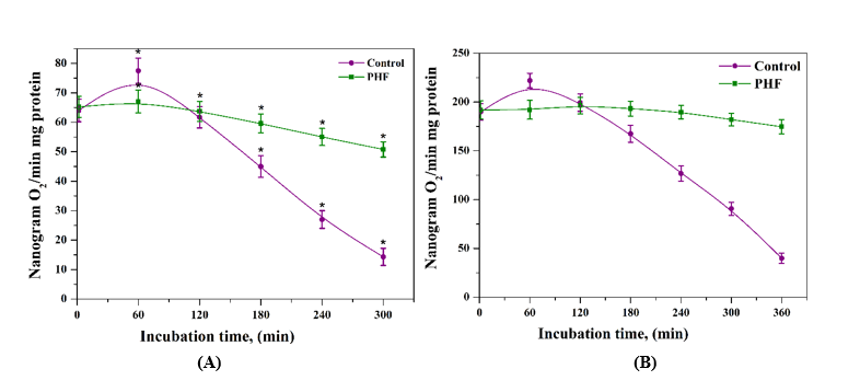 Experiments conducted at physiological temperature further confirmed this membrane-stabilizing effect (Figure 3(A)). After 60 min of incubation at 37 °C, control mitochondria displayed a 1.21-fold increase in NADH oxidase activity, while no change was observed in the PHF group [23]. At longer time points (180 - 300 min), NADH oxidase activity in controls decreased sharply (1.25 - 1.78-fold), whereas the PHF-treated group showed significantly milder reductions (1.09 - 1.22-fold), reinforcing the conclusion that PHF preserves enzymatic integrity under stress. The same pattern was observed for succinate oxidase: While control mitochondria showed a biphasic activity curve (initial activation followed by decline), PHF-treated mitochondria maintained stable activity throughout the incubation (Figure 3(B)). At 360 min, succinate oxidase activity in the control dropped by 1.69-fold, while PHF-treated mitochondria exhibited no significant loss, supporting PHF’s role in maintaining membrane structural stability [24].