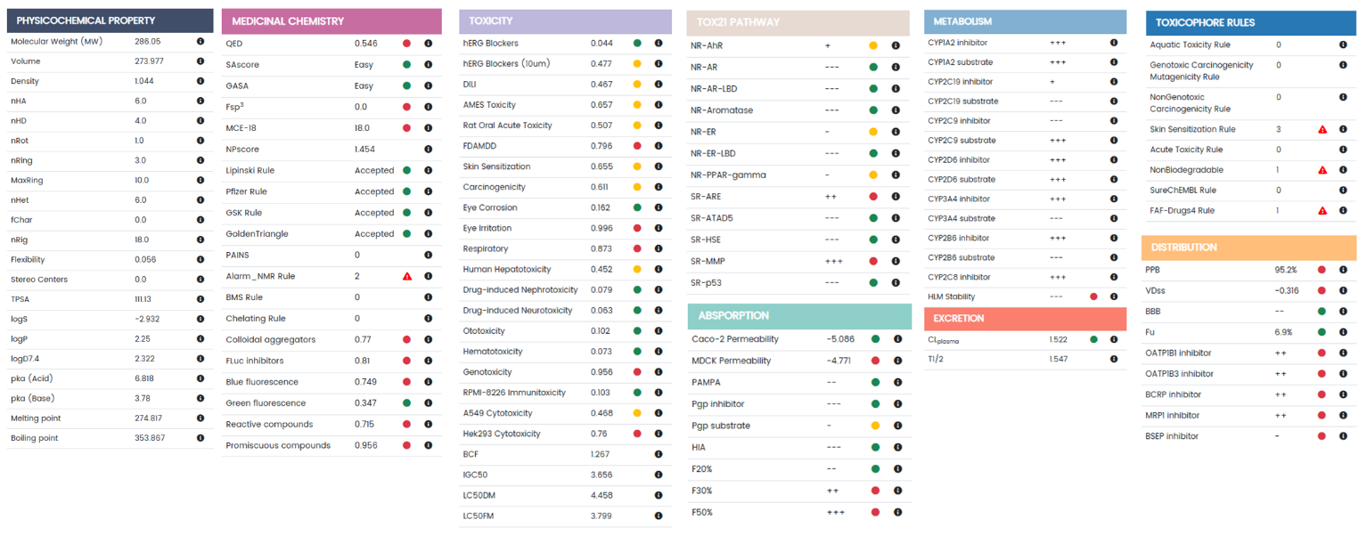 Figure 6 In silico prediction of pharmacokinetic and ADMET properties of 3,5,7,2’,6’-pentahydroxyflavanone (PHF) based on ADMETlab analysis. The compound demonstrates acceptable physicochemical characteristics, complies with major medicinal chemistry filters (Lipinski, Pfizer, GSK), and shows moderate lipophilicity (logP = 2.25). Absorption parameters suggest low permeability, while distribution is characterized by high plasma protein binding (PPB = 95.2%) and moderate unbound fraction (Fu = 6.9%). The compound acts as both a substrate and inhibitor of multiple CYP450 isoforms, particularly CYP1A2, CYP2D6, and CYP3A4. Toxicological indicators reveal low predicted cardiotoxicity (hERG), moderate hepatotoxicity, and potential for genotoxicity. Colored dots indicate risk levels: Green (favorable), yellow (moderate), red (unfavorable), and red triangles (alerts).