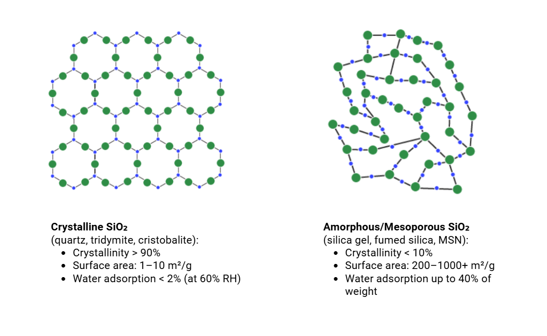 These quantitative distinctions indicate that amorphous and mesoporous SiO2 forms are indispensable for active packaging applications, since crystalline structures lack sufficient adsorption and release capacity. For instance, mesoporous silica nanoparticles (MSNs) commonly achieve encapsulation efficiencies above 70% and can extend the release of antioxidants or antimicrobials for more than 7 days under refrigerated conditions [16]. Studies also report microbial reduction exceeding 3 log CFU/g in foods treated with MSN-based active films, compared with less than 1 log CFU/g in controls [16]. A minimum proportion of amorphousness is therefore required, and higher amorphous content is directly correlated with improved adsorption and controlled release performance. Similar patterns have been highlighted in research on other bioactive systems, where functional outcomes such as antioxidant inhibition (IC₅₀ values ranging from 0.4 to 2.6 µg/mL) and bioactive compound retention were strongly influenced by structural accessibility and concentration of active constituents [17,18]. These parallels reinforce that, within the framework of food packaging, SiO2 with predominantly amorphous or mesoporous structures demonstrates the highest potential as a carrier for encapsulated antioxidants and antimicrobials. An illustration of the tetrahedral structure and the distinction between crystalline and amorphous SiO2 can be seen in Figure 1.