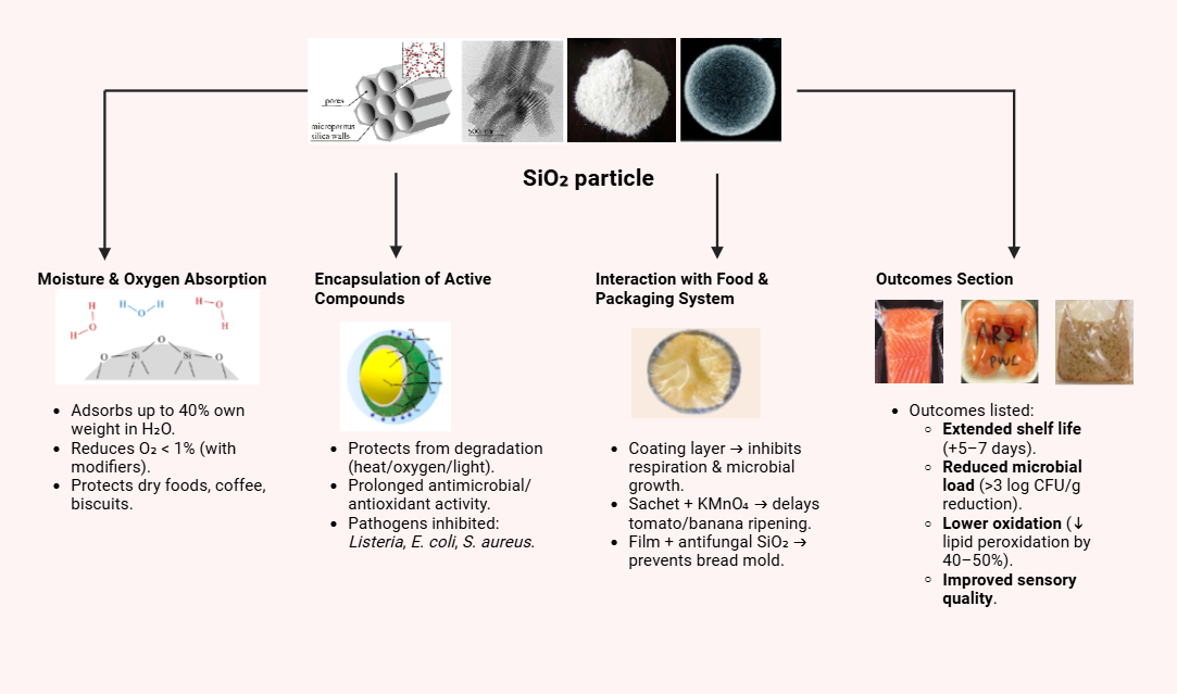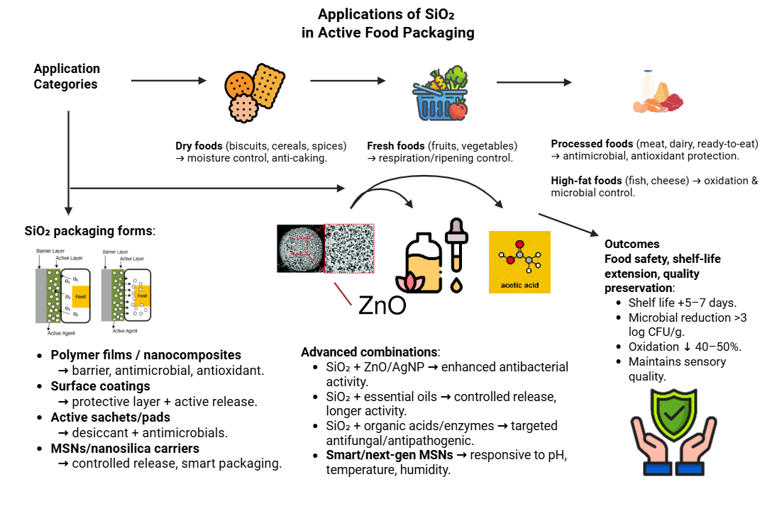 This review therefore critically examines the role of SiO2 in active packaging, focusing on its physicochemical properties, mechanisms of action, applications, effectiveness in microbial control and shelf-life extension, and regulatory aspects. By highlighting both opportunities and limitations, it aims to guide future development of SiO2-based active food packaging technologies.