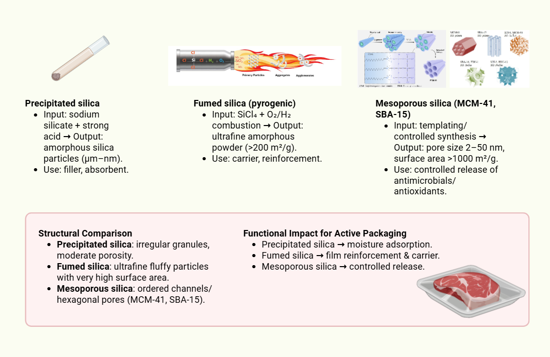 Figure 2 Production methods of SiO2: Precipitated, fumed, and mesoporous forms with their functional characteristics.