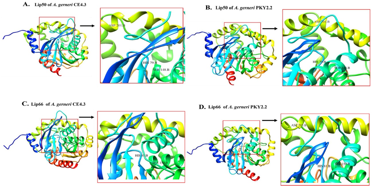 Figure 4 3D model of lipase proteins with a zoomed-in view of the catalytic triad. (A) Lip50 of A. gerneri CE4.3, (B) Lip50 of A. gerneri PKY2.2, (C) Lip66 of A. gerneri CE4.3, and (D) Lip66 of A. gerneri PKY2.2.