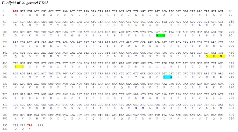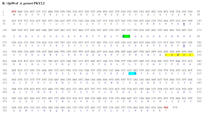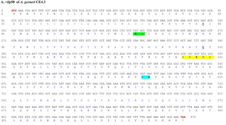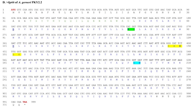 Figure 3 The nucleotide and deduced amino acid sequences of the lip50 and lip66 genes from A. gerneri CE4.3 and PKY2.2. The start codon (ATG) and stop codon (TAA) are shown in red letters, while amino acids at the C-terminal domain (mature protein) are shown in blue letters. Bold letters indicate the expected catalytic triad. Green, yellow, and blue highlights represent the expected conserved regions (active site), while aspartate (D) residues involved in calcium binding are underlined.