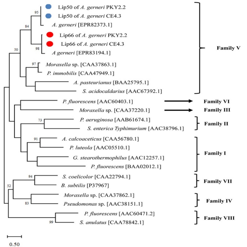 The phylogenetic tree analysis showed that Lip50 from both strains are closely related to A. gerneri DSM14967 (EPR83194.1) and Lip66 from both strains are closely related to A. gerneri DSM14967 (EPR82373.1) (Figure 5). Additionally, Lip50 and Lip66 from both strains are closely related to lipase proteins from Moraxella sp. (CAA37863.1), Psychrobacter immobilis (CAA47949.1), Acetobacter pasteurianus (BAA25795.1), and Sulfolobus acidocaldarius (AAC67392.1) (Figure 5), which are members of the lipase family V [32,33]. The lipase enzyme group in family V originates from a variety of organisms adapted to different environments, such as mesophilic bacteria (Acetobacter pasteurianus), cold-adapted bacteria (Moraxella sp., Psychrobacter immobilis), and the thermoacidophilic archaeon (Sulfolobus acidocaldarius) [32,33]. Furthermore, the lipase from A. gerneri has never been previously classified into any family. Therefore, the data of Lip50 and Lip66 from both strains of A. gerneri can serve as preliminary information for the classification of A. gerneri lipases into the family V.