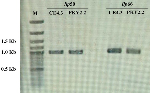 The lipase-producing bacteria isolated from grease traps in canteens at the University of Phayao revealed a total of 42 isolates that hydrolyze olive oil in the screening medium, resulting in the production of glycerol and free fatty acids [19]. These products cause a color change in bromocresol purple, leading to the formation of yellow colonies. All isolates were tested for lipolytic activity on tributyrin agar plates. The two isolates, PKY2.2 and CE4.3, exhibited large clear zones (Figure 1) and had EAI values of 2.4 ± 0.1 and 1.9 ± 0.1, respectively. The lipase activity was 8.6 U/L for PKY2.2 and 7.2 U/L for CE4.3. The higher EAI value of PKY2.2 indicates stronger extracellular enzyme diffusion, while its lipase activity supports catalytic potential, consistent with that observed in Acinetobacter junii [20], Acinetobacter haemolyticus KV1 [21], and Bacillus altitudinis Ant19 [22]. These findings suggest that PKY2.2 may represent a promising candidate for further research and potential biotechnological applications. Additionally, the phenotypic characteristics of CE4.3 and PKY2.2 revealed that they are Gram-negative coccobacilli, which were identified as A. gerneri. After CE4.3 and PKY2.2 were confirmed to be A. gerneri, information about the lipase genes of A. gerneri was searched from the GenBank database (May 2024). The search provided specific data on the A. gerneri DSM 14967 strain, which was annotated to contain two lipase genes. The first gene is located at nucleotide positions 1,892 - 2,868 of contig 50 (lip50), and the second gene is located at nucleotides 14,905 - 15,903 of contig 66 (lip66). The comparative analysis of the nucleotide sequences of these 2 genes revealed differences. This information led to the question of whether the A. gerneri CE4.3 and PKY2.2 have lipase genes similar to those of the A. gerneri DSM 14967 strain. To investigate, nucleotide sequence data from A. gerneri DSM 14967 were used to design primers for detecting and sequencing the two lipase genes. The PCR results revealed that A. gerneri CE4.3 and PKY2.2 contain both the lip50 and lip66 genes, with PCR products of approximately 900 bp and 1,000 bp corresponding to lipase genes in lip50 and lip66, respectively (Figure 2). Therefore, the results indicate that A. gerneri CE4.3 and PKY2.2 contain genes encoding lipase, enabling both strains to degrade fats.