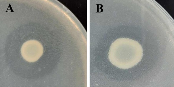 Figure 1 Clear zone of bacterial isolates on tributyrin agar (TA). (A) PKY2.2 and (B) CE4.3.