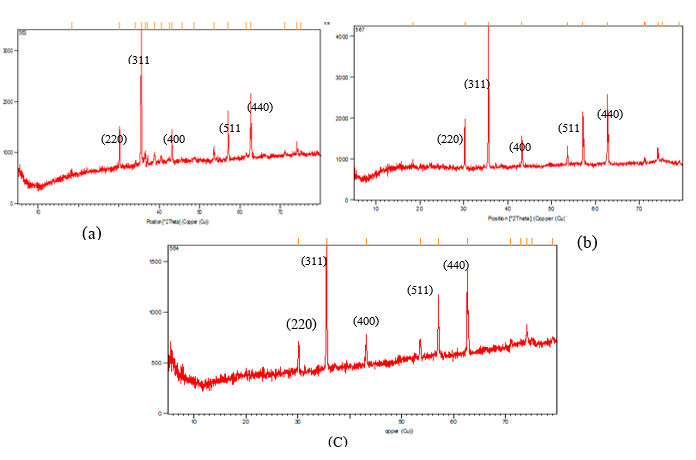Figure 7 X-ray patterns of Mg1-xCuxFe2O4 using varied Mg ratios at (a) x = 0, (b) x = 0.3, (c) x = 0.7 after plasma.