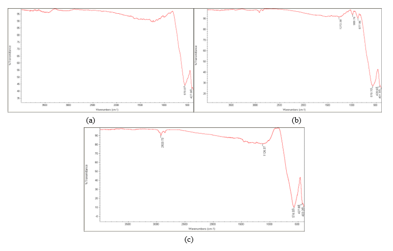 Figure 11 Displays the FTIR for the ferrite component Mg1-xCuxFe2O4 following plasma exposure, with (a) x = 0, (b) x = 0.3, (c) x = 0.7.