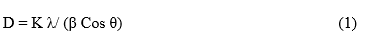 Evidently, the face-centred cubic (FCC) structure may be indexed to MgFe2O4 (ICSD Card No.01-088-1937) [17]. The XRD spectra of the compound Mg1-xCuxFe2O4 are shown in Figures 6(a) - 6(c). Examining further, diffraction peaks are seen at the crystal planes (220), (311), (400), (511) and (440), as shown in Figures 4(a) - 4(b). These peaks verify that all of the produced Mg1-xCuxFe2O4 samples include a face-centred cubic (FCC) spinel phase. These doped samples don’t exhibit any signs of secondary phases, proving the product’s great purity of the cubic spinel structure even at different ratios of Cu²⁺ concentrations. The common pattern of crystallisation development (311) from 2𝜃 = 35.8 to 35.5 indicates a reduction in the crystalline frit of magnesium as the distance between the peaks grows and reduces based on the concentration of Cu⁺² by Hammad et al. [18] demonstrated that the size of the crystallite as measured by XRD data and the particle size acquired are compatible. Prior to plasma exposure, structural data are displayed in Table 2 when hkl (Miller transactions), FWHM (full width at half maximum), Spacing between crystal planes (dhkl) and lattice constant (a) and D the granular size is determined by applying the Scherrer equation found in Eq. (1) [19]. The formula in question includes a constant (k) called the form factor, β representing the full-width half optimum, θ representing Bragg’s diffraction angle, and λ representing the X-ray wavelength (1.545 nm).