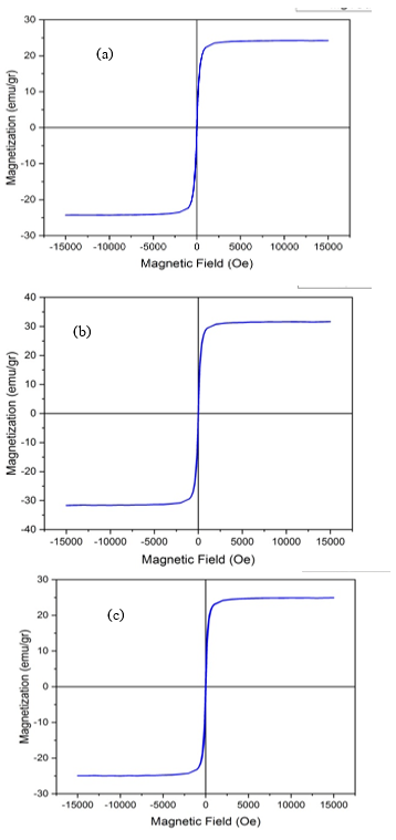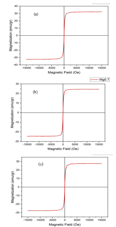 Figure 8 Magnetic curves of hysteresis of Mg1-xCuxFe2O4 at (a) x = 0, (b) x = 0.3, (c) x = 0.7 before plasma exposure.