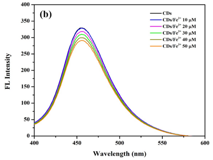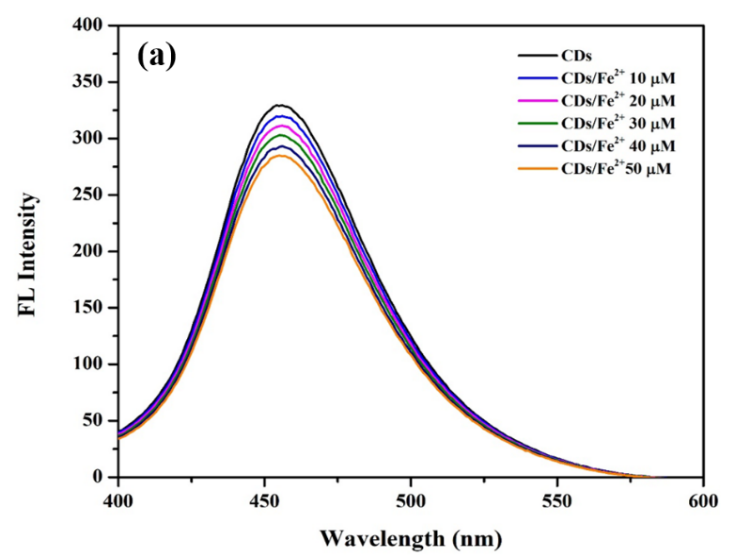 The trace determination of Fe2+/ Fe3+ was carried out using dilute solution of CDs at room temperature with 1 mM of EDTA as an auxiliary complexing medium. The both kinds of the iron hydrate (FeSO4•7H2O and FeCl3•6H2O) were used for the standard stock solution of Fe2+ and Fe3+. To study of both sensitivity and selectivity of the fluorescence quenching sensor for the mixed fraction of Fe2+/Fe3+ with different concentration, the following solution included the addition of 0.1 M NaCl and 5 mM EDTA into the CDs solution (200 μL) then adjusted with Britton-Robinson buffer at pH 4 under the optimum condition. Following, their assigned different concentration ratios of total Fe2+/Fe3+ ions at 10, 20, 40, 60, 80 and 100 μM were added into the reaction mixture in a 10-mL volumetric flask. After heating at 50 °C for 10 min in an ultrasonic water bath, the mixed solution was allowed to cool to room temperature (~25 °C), after which fluorescence measurements were recorded at an emission wavelength of 454 nm (λex = 330 nm).
