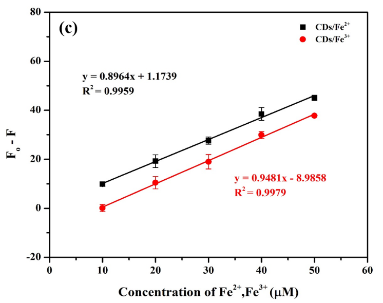 The effectiveness of Fe2+ and Fe3+ detection is confirmed by the fluorescence spectra of CDs with various concentrations of Fe2+ and Fe3+ ions, as shown in Figure 6 [39]. These spectra present a gradual decrease in CD fluorescence with an increase in Fe2+ and Fe3+ concentrations, as indicated in Figures 6(a) and 6(b) [33]. According to Figure 6(c), the comparison of the Fo -F quenching efficiencies of CDs in the presence of different amounts of Fe2+ and Fe3+ in the CDs solution is also given [24,34]. For the relationship between Fe2+ and Fe3+, the parallel linear equations of both of lines with nearly identical slope values are presented to demonstrate the fluorescence quenching ability. This indicates that the fluorescence response of CDs media complexed with Fe2+ and Fe3+ was the same.
