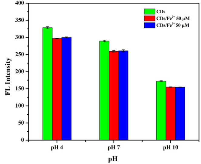 The effect of pH solution on the fluorescence quenching of CDs by Fe2+ and Fe3+ was also studied, as shown in Figure 7. The findings suggest that the FL intensities of CDs were higher at pH 4 [34] and the difference in the fluorescence quenching of Fe2+ and Fe3+ was also more significant at this pH than that of other pH values. These results seem to demonstrate that the FL intensity of CDs dispersed in the acid medium is stronger than that of the alkaline medium and the FL intensity gives the highest level at pH 4. Our work, thus, confirms that the as-prepared CDs have pH dependence because we were able to change the FL intensity by changing the pH value of the CDs solution [35]. Hence, the following studies were better set to concentrate on this optimal pH effect.