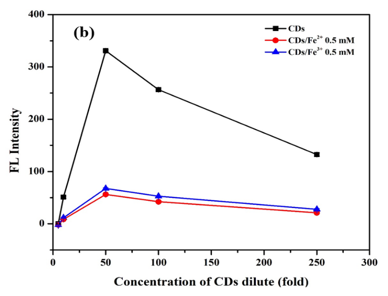 Figure 5 (a) Fluorescence (FL) intensities of various concentrations of the CDs expressed as its dilution from 10 to 1000 folds and (b) the quenching effect of CDs in the presence of 0.5 mM of Fe2+ and Fe3+ at ex/ em = 330/454 nm, slit width 3/3.