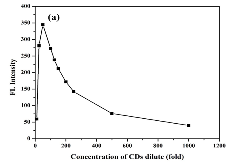 Fluorescence intensity was used to estimate the effect of CDs concentration. As a result, the amounts of CDs required to monitor their complex interactions of Fe2+ and Fe3+ are shown in Figure 5, which is definitely very high and significant at a diluted solution of the CDs about 50 folds (200 µL). Thus, it was a choice to evaluate the fluorescence quenching effect of both Fe2+ and Fe3+ using a 50-fold dilution of the CDs extract for further experiments.