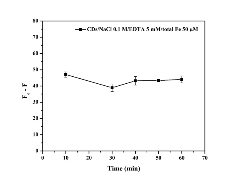 The impact of the reaction time between total iron (Fe2+/Fe3+) and the CDs at various time intervals was also investigated at 10, 30, 40, 50 and 60 min. The results of the reaction time as shown in Figure 10 were not affected significantly while the time increased continuously, confirming the excellent stability of the reaction mixture [35,38]. Because of this, it was chosen to concentrate at about 10 min in the following studies.