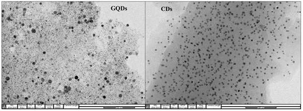 The morphological images of both CDs and GQDs were comparatively demonstrated by transmission electron microscopy (TEM) to confine their nanoparticle dispersion and particle size as well.