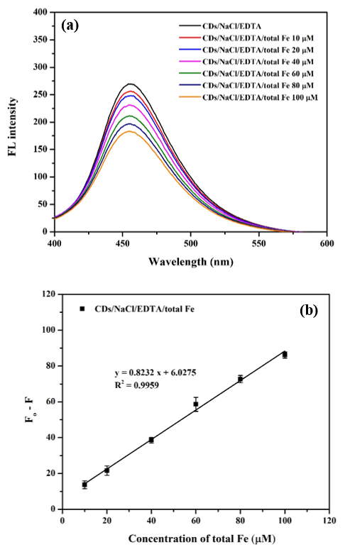 Figure 12 (a) The fluorescence spectra of the CDs at different concentrations of total Fe ions; (b) the corresponding linear calibration plots between Fo-F vs. concentrations of total Fe ions as their working range. The detection was performed under the optimized conditions of 200 µL CDs, NaCl 0.1 M, EDTA 5 mM in Britton Robinson buffer solution at pH 4 and heating under ultrasonic bath at 50 °C for 10 min.