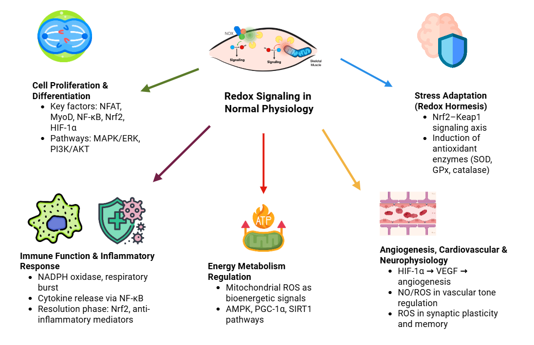 Redox signaling has emerged as a key mechanism linking cellular metabolism with systemic physiology through controlled fluctuations of reactive oxygen and nitrogen species (ROS/RNS). Once considered merely harmful byproducts, ROS and RNS are now recognized as context-dependent messengers that regulate protein modifications, transcriptional programs, and adaptive stress responses. This review aims to synthesize current knowledge on the molecular mechanisms, physiological roles, pathological disruptions, and therapeutic opportunities of redox signaling. To achieve this, relevant literature was systematically retrieved from major scientific databases using predefined keywords and inclusion criteria to ensure comprehensive and up-to-date coverage. Under physiological conditions, redox pathways orchestrate essential processes including cell proliferation, differentiation, immune defense, metabolic adaptation, angiogenesis, and neurophysiology. When chronically imbalanced, however, these pathways shift toward pathological outcomes, contributing to cardiovascular dysfunction, neurodegeneration, cancer progression, metabolic disorders, and accelerated aging. This dual role—protective in physiological states yet detrimental under dysregulation—emerges as a unifying principle in human biology. Clinically, conventional antioxidant therapies have delivered inconsistent outcomes, while more selective strategies such as Nrf2 activators and mitochondria-targeted antioxidants show greater promise by preserving beneficial signaling while correcting pathological states. In addition, redox biomarkers are gaining relevance as tools for precision diagnostics and patient-tailored interventions. In conclusion, redox signaling functions as both a guardian of homeostasis and a driver of disease. Advancing mechanistic understanding through omics technologies and real-time biosensing is expected to unlock novel diagnostic and therapeutic strategies, reinforcing redox signaling as a central axis for precision medicine.