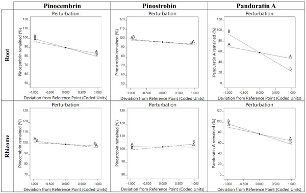 Figure 9 Perturbation plots of individual flavonoids—pinocembrin, pinostrobin, and panduratin A—remained in B. rotunda roots (top) and rhizomes (bottom) sourced from various regions of Thailand under varying storage temperatures and times, compared to their initial levels. The letters A and B denote temperature and time, respectively.