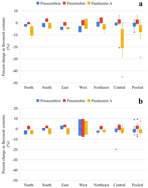 Figure 3 Box-whisker plots showing the percent change in individual flavonoids—pinocembrin, pinostrobin, and panduratin A—in the (a) roots and (b) rhizomes of B. rotunda sourced from various regions of Thailand, as well as pooled data, in gamma-irradiated samples compared to non-gamma-irradiated samples.