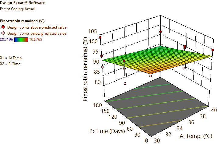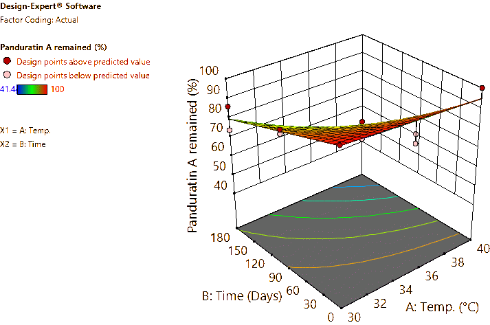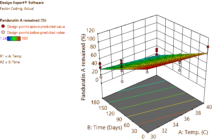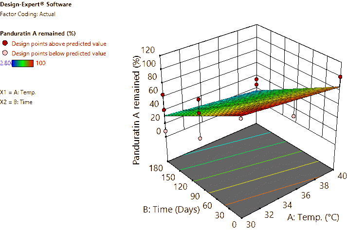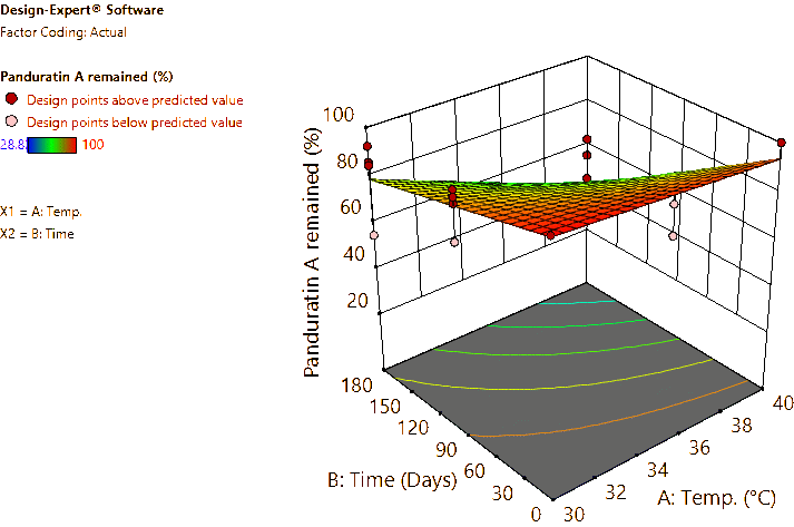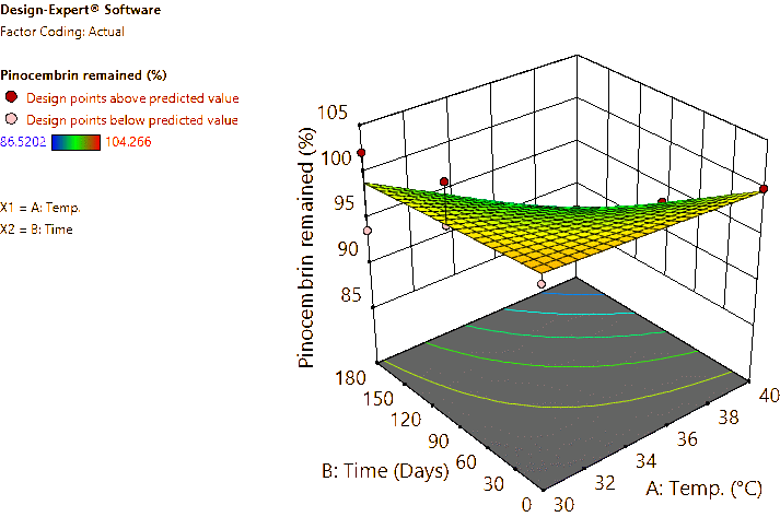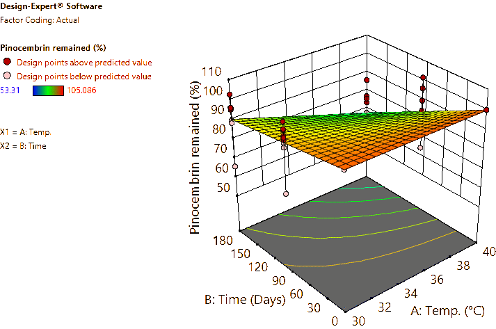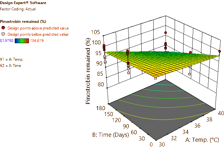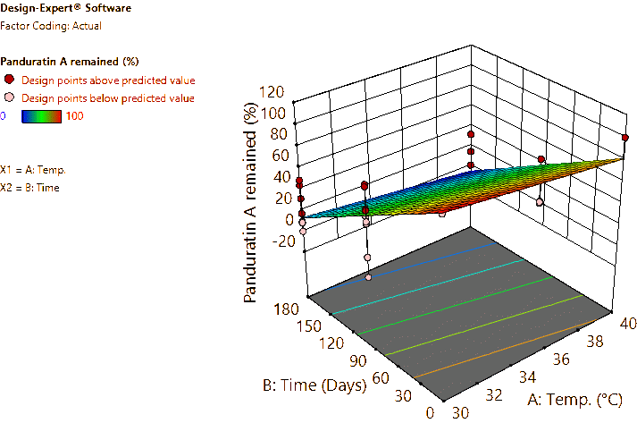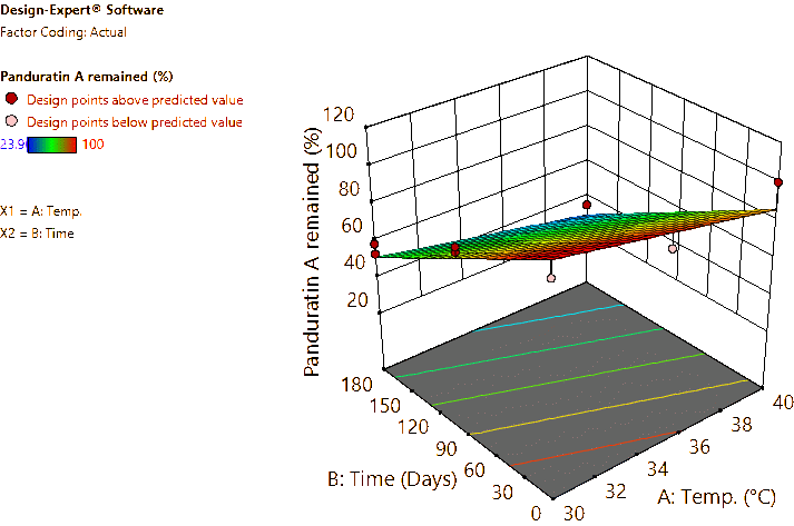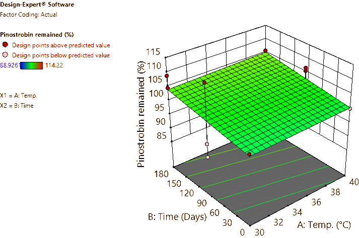 Coded and actual equations for the prediction of flavonoid contents (pinocembrin, pinostrobin, and panduratin A) in the roots and rhizomes of B. rotunda based on storage temperature and time are shown in Table 1 . Coded equations were used to evaluate the degree of each factorʼs effect on the response by transforming all factors into the same range, from −1 - +1. Conversely, actual equations were employed to predict responses using the precise or actual values of each factor [50]. In this study, coded equations revealed that time was the primary factor contributing to the reduction of pinocembrin, pinostrobin, and panduratin A contents in roots, as well as panduratin A in rhizomes, compared to temperature and the interaction between temperature and time. For pinocembrin and pinostrobin in rhizomes, temperature was the dominant factor reducing their content, while time appeared to increase pinostrobin content. Furthermore, the interaction between temperature and time did not affect pinostrobin content in rhizomes, as it was not included in the equation. Based on the coefficients in the coded equations, temperature, time, and their interaction had a greater reduction effect on panduratin A than on pinocembrin and pinostrobin, respectively. According to the p -values from ANOVA, the analysis highlighted that temperature, time, and their interaction significantly affected the stability of flavonoids in terms of pinocembrin, pinostrobin, and panduratin A contents. An exception was observed for pinostrobin in rhizomes, where temperature did not significantly influence its stability.