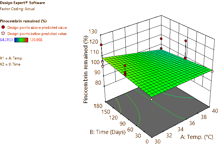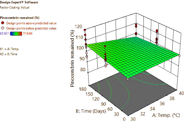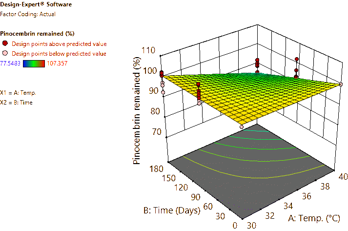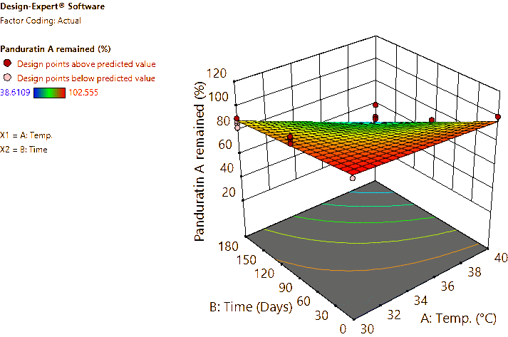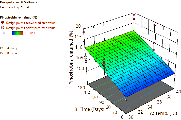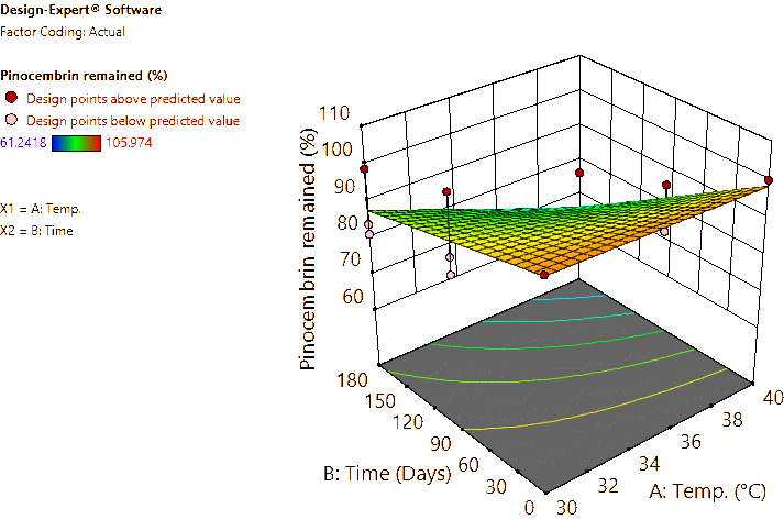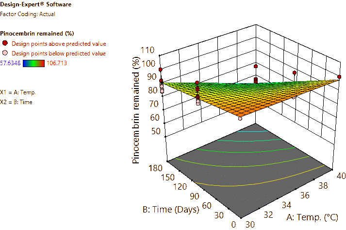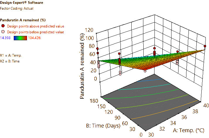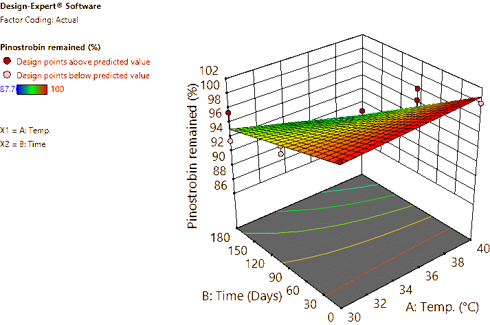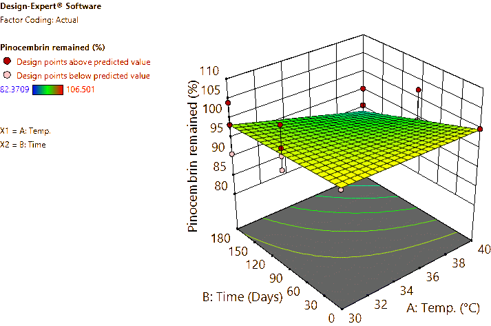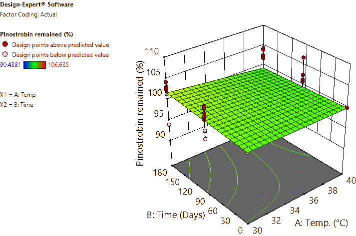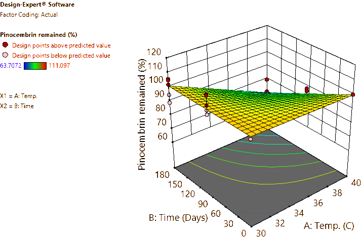 Coded and actual equations for the prediction of flavonoid contents (pinocembrin, pinostrobin, and panduratin A) in the roots and rhizomes of B. rotunda based on storage temperature and time are shown in Table 1 . Coded equations were used to evaluate the degree of each factorʼs effect on the response by transforming all factors into the same range, from −1 - +1. Conversely, actual equations were employed to predict responses using the precise or actual values of each factor [50]. In this study, coded equations revealed that time was the primary factor contributing to the reduction of pinocembrin, pinostrobin, and panduratin A contents in roots, as well as panduratin A in rhizomes, compared to temperature and the interaction between temperature and time. For pinocembrin and pinostrobin in rhizomes, temperature was the dominant factor reducing their content, while time appeared to increase pinostrobin content. Furthermore, the interaction between temperature and time did not affect pinostrobin content in rhizomes, as it was not included in the equation. Based on the coefficients in the coded equations, temperature, time, and their interaction had a greater reduction effect on panduratin A than on pinocembrin and pinostrobin, respectively. According to the p -values from ANOVA, the analysis highlighted that temperature, time, and their interaction significantly affected the stability of flavonoids in terms of pinocembrin, pinostrobin, and panduratin A contents. An exception was observed for pinostrobin in rhizomes, where temperature did not significantly influence its stability.