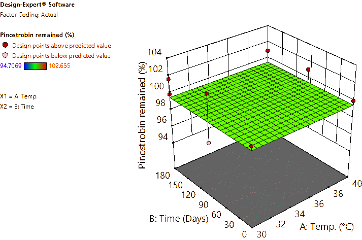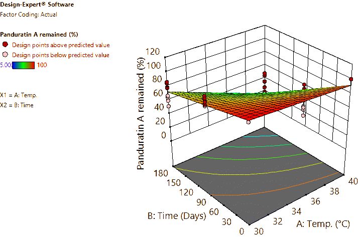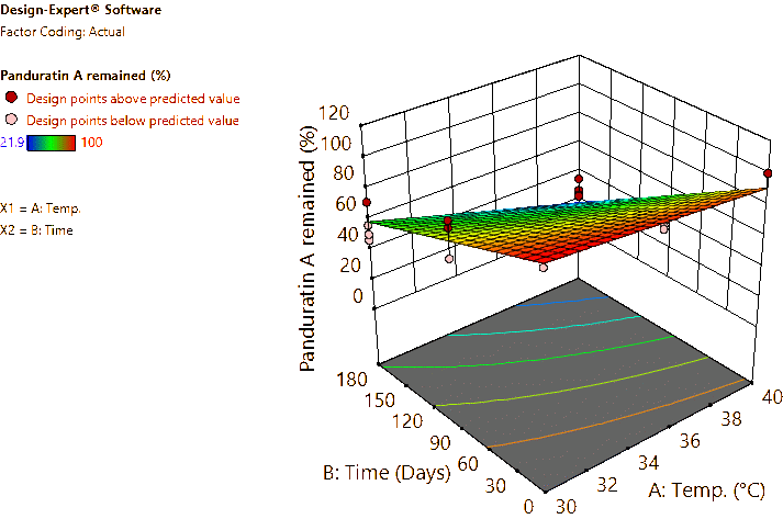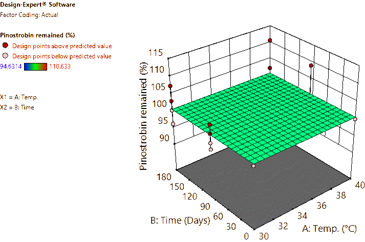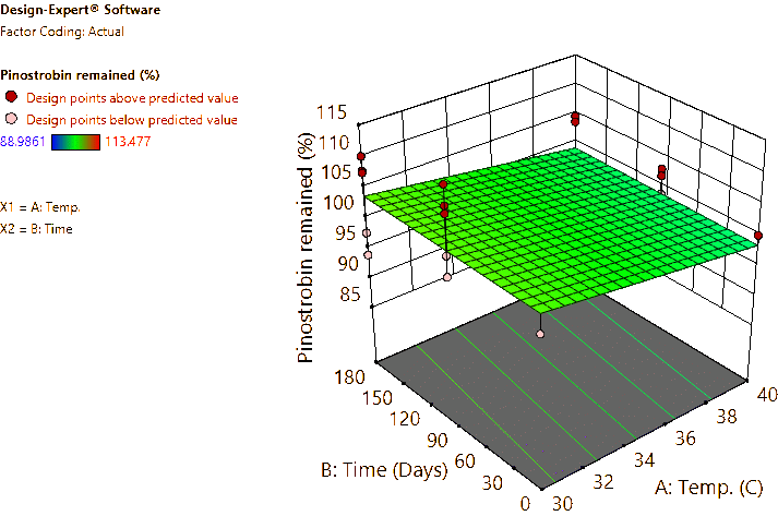 For the B. rotunda root and rhizome powders, approximately 5 g of each sample was weighed and placed into 20-mL glass vials with caps, then packed into plastic boxes and stored in a climate chamber (Memmert GmbH + Co. KG, Büchenbach, Germany) under controlled conditions at 30 °C/75% RH and 40 °C/75% RH. Samples were taken at 0, 90 and 180 days to analyze the contents of pinocembrin, pinostrobin, and panduratin A using the HPLC method described earlier. Response surfaces were generated, and the predicted equations were reported. The modeling was performed using the licensed Design-Expert v.11 software (Stat-Ease Inc., MN, USA).