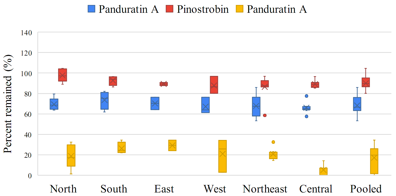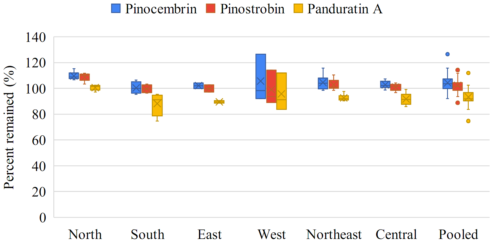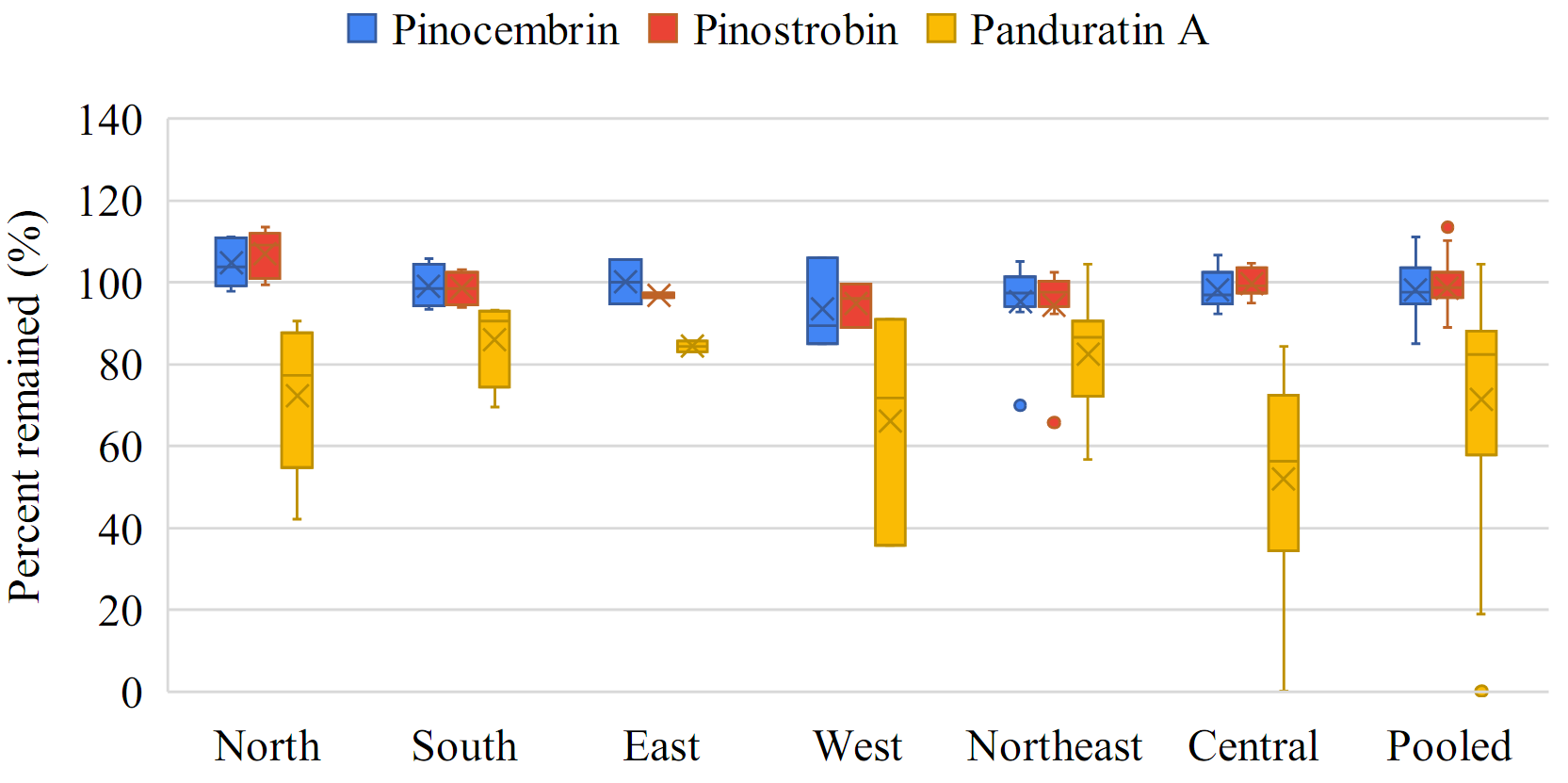The box-whisker plots showing the percent change in individual flavonoids—pinocembrin, pinostrobin, and panduratin A—in the roots and rhizomes of B. rotunda sourced from various regions of Thailand, as well as pooled data, in gamma-irradiated samples compared to non-gamma-irradiated samples are shown in Figure 3 . Pinocembrin, pinostrobin, and panduratin A demonstrated greater stability in rhizomes compared to roots, as indicated by the median change of individual flavonoids in rhizomes approaching 0%.