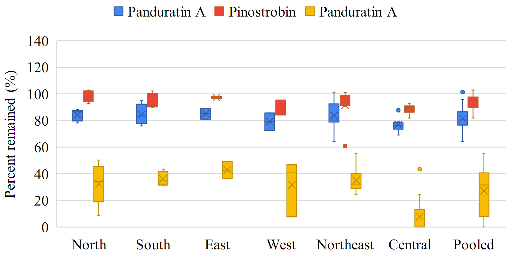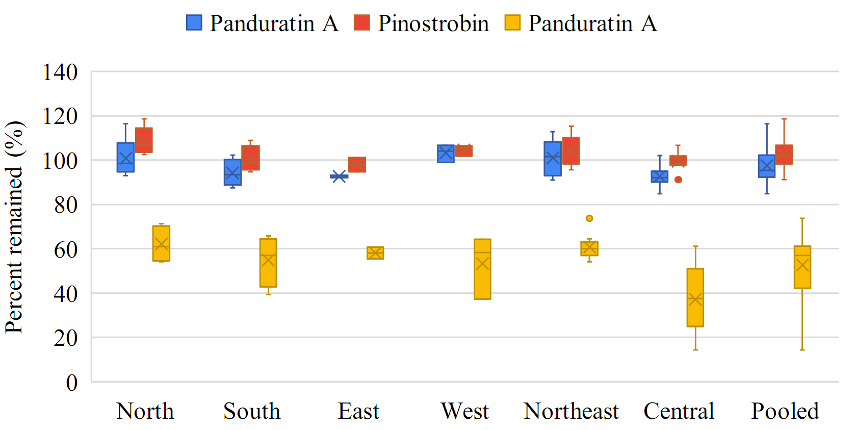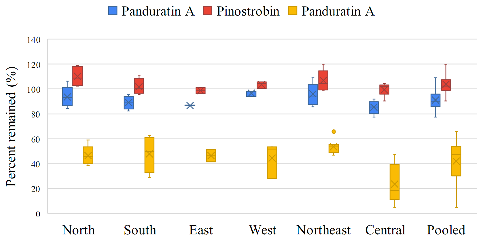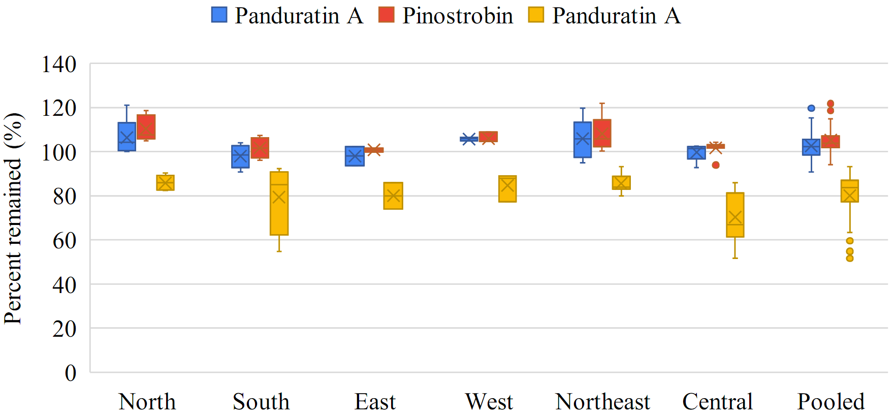 The box-whisker plots showing the percent change in individual flavonoids—pinocembrin, pinostrobin, and panduratin A—in the roots and rhizomes of B. rotunda sourced from various regions of Thailand, as well as pooled data, in gamma-irradiated samples compared to non-gamma-irradiated samples are shown in Figure 3 . Pinocembrin, pinostrobin, and panduratin A demonstrated greater stability in rhizomes compared to roots, as indicated by the median change of individual flavonoids in rhizomes approaching 0%.