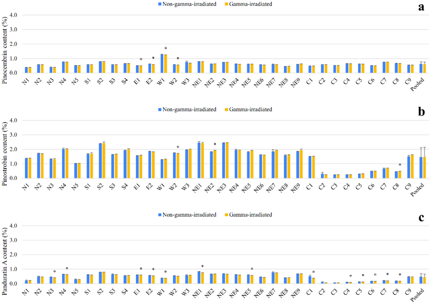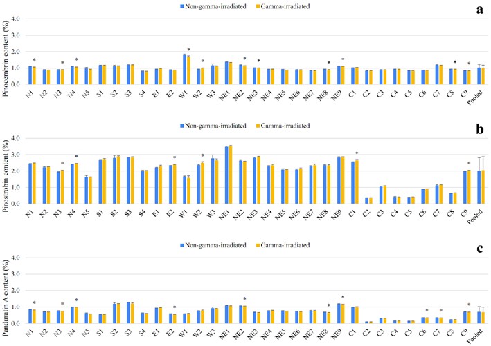 Figure 2 Contents of individual flavonoids—pinocembrin (a), pinostrobin (b), and panduratin A (c)—in the rhizomes of B. rotunda sourced from northern (N), southern (S), eastern (E), western (W), northeastern (NE), and central (C) Thailand, comparing gamma-irradiated and non-gamma-irradiated samples. The numbers following each regional abbreviation (e.g., N1, N2) represent individual collection sites within that geographical region. An asterisk (*) indicates a significant alteration in the content of an individual flavonoid compared to levels in non-gamma-irradiated samples.