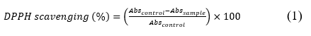The DPPH radical scavenging assay was slightly modified from the method described in a previous study [26]. A 100 µL sample solution was added to a 96-well plate (n = 3), followed by an equal volume of 0.2 mM DPPH methanolic solution. The mixture was thoroughly mixed and incubated at room temperature in the dark for 30 min. The absorbance was then measured at 517 nm using a microplate reader (Bio-Rad Laboratories, Inc., CA, USA). Antioxidant activity was expressed as percent DPPH scavenging (Eq. (1). L -ascorbic acid (10 µg/mL) was used as a positive control to validate the method.