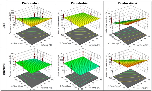 Figure 8 Response surfaces of individual flavonoids—pinocembrin, pinostrobin, and panduratin A—remained in B. rotunda roots (top) and rhizomes (bottom) sourced from various regions of Thailand under varying storage temperatures and times, compared to their initial levels.